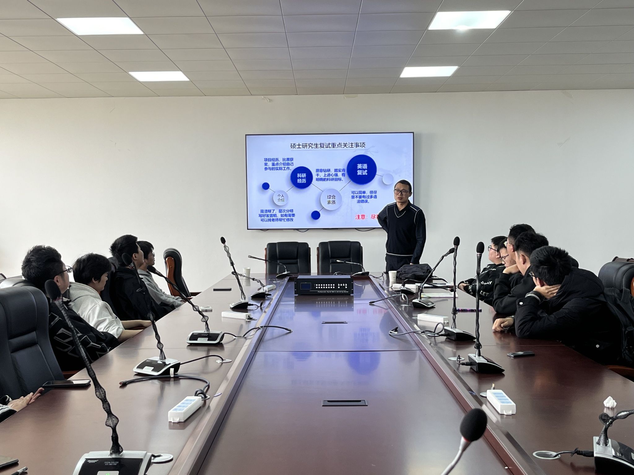 会上,教研室专业老师从研招形式、复试内容、面试技巧和调剂注意事项等几方面,结合自身经历作详细讲解,鼓励同学们努力准备复试、低分积极调剂,坚定考研复试信心,积极准备,成功上岸。教研室专业老师与现场同学们进行了积极互动,并对同学们的疑虑和问题进行了一一解答。